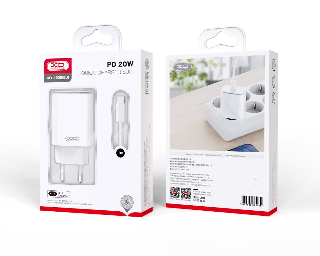 220V XO 20W, USB-C, PD με καλώδιο Type-C σε Type-C, L90B /white/